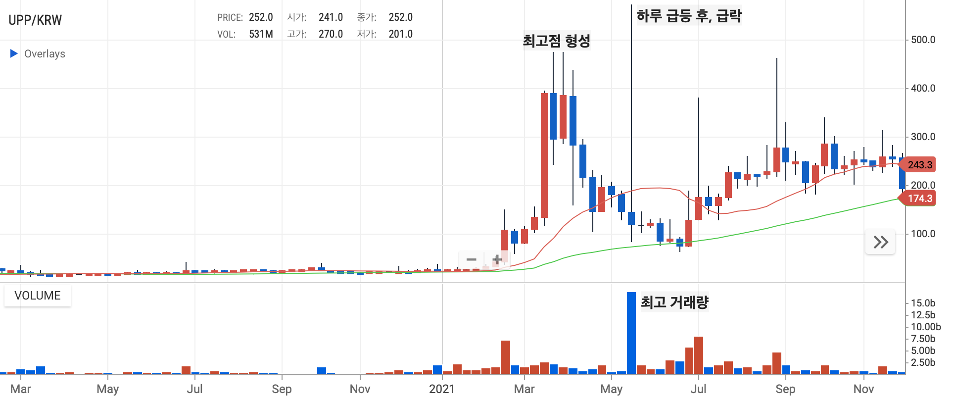 - 2021년 불장대비, 최대 하락율: -90% (고 574원, 저 51원)