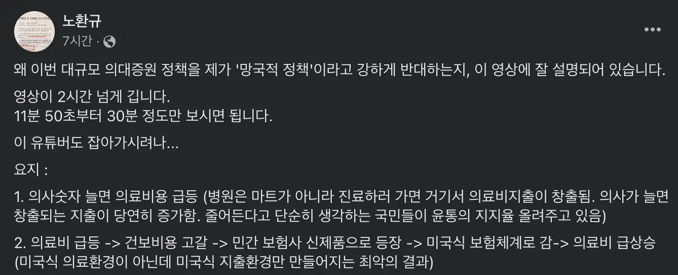 최근 그의 글들을 살펴보면 '의사를 악마화하는 작업세력의 실체', '의대정원이 묶여있었고 심지어 의사수를 줄였다'는 대통령 중장에 대한 팩트 체크', '의사를 악마로 몰고 간 대통령의 한 마디'등 현재 의사협회와 정부의 갈등에 대한 본인의 주장을 포스팅하고 있습니다.