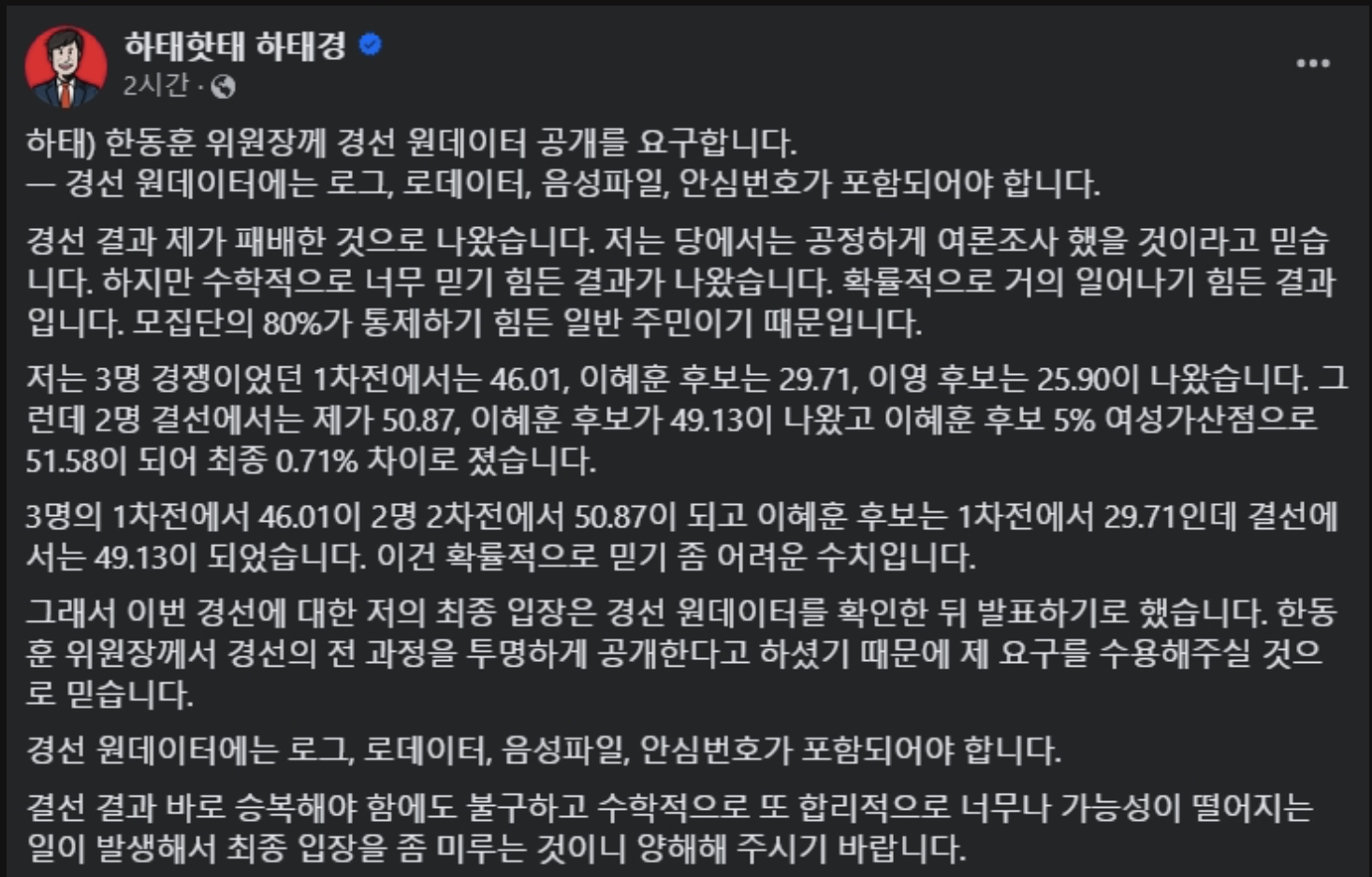 이번 입장문을 통해 하태경 의원은 "한동훈 비대위원장께 경선 원데이터 공개를 요구한며 경선 원데이터에는 로그, 로데이 터, 음성파일, 안심번호가 포함되어야 한다"라고 요구하고 있습니다.