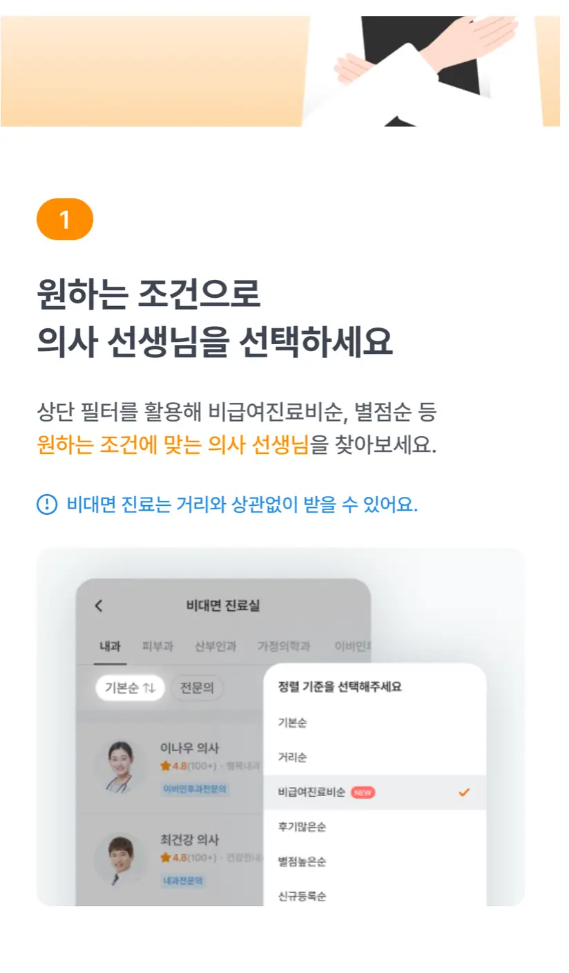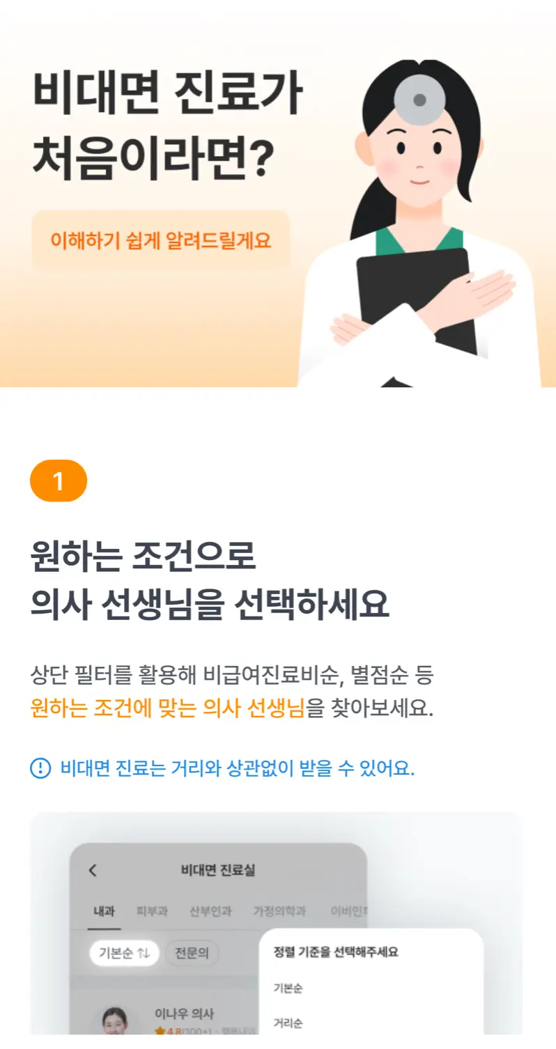 ②비대면 진료의 경우, 나와 거리가 먼 병원도 상관없으며 평점에 따라 의사 선생님 선택이 가능합니다.