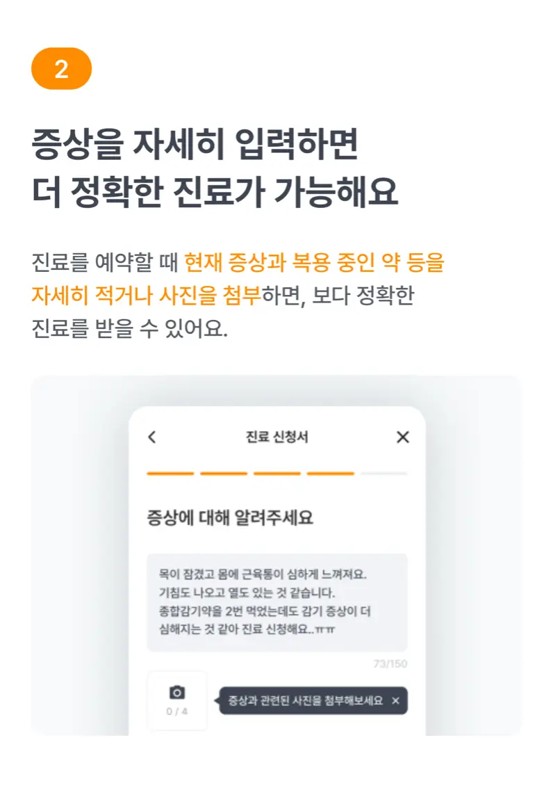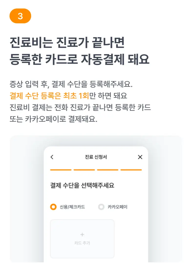③ 병원 선택 후, 현재 증상을 자세히 입력하고 진료 후 결제를 위한 카드 등록을 해주세요.
