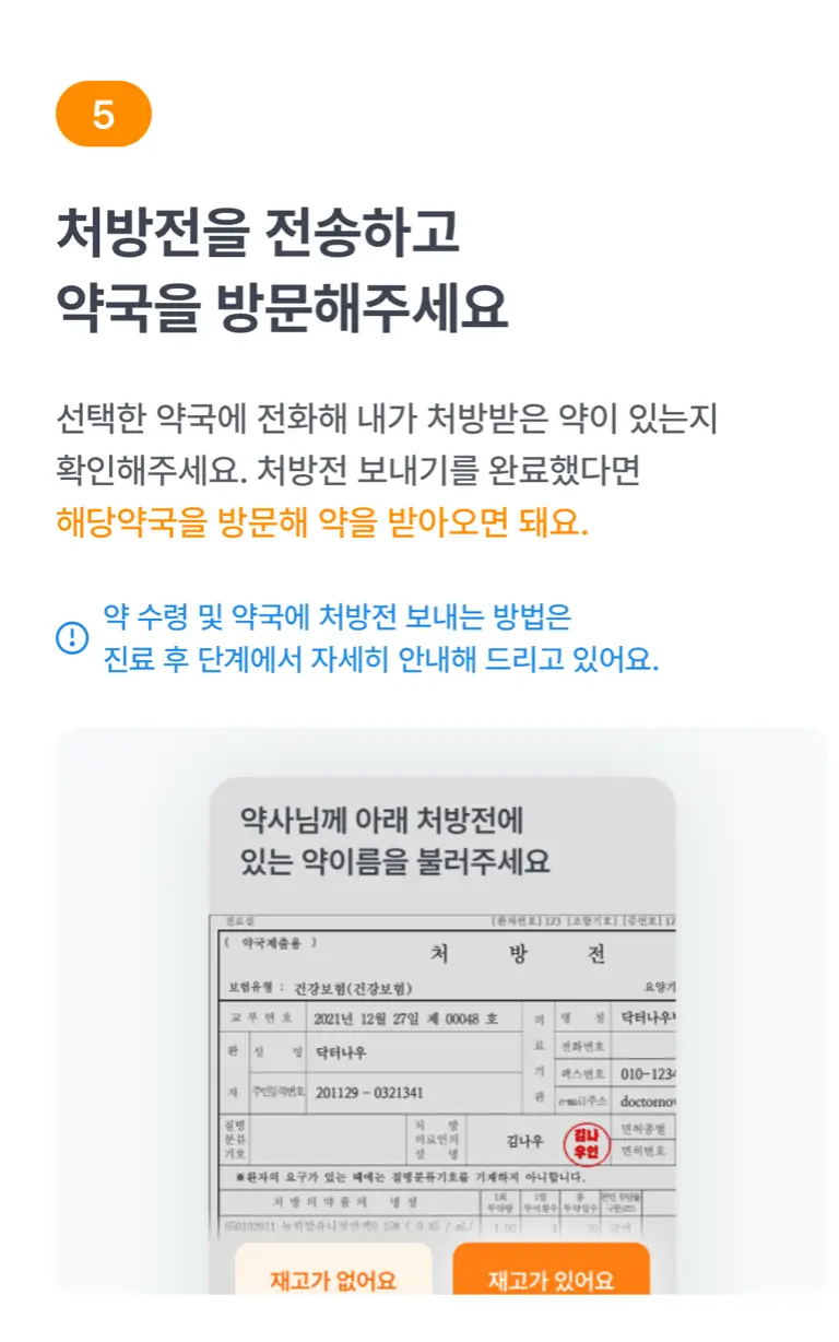 비대면 진료의 경우 현재 닥터나우, 똑닥, 굿닥 어플로만 예약 가능합니다. 각 어플을 통해 병원 진료 예약 후, 전화나 화상통화로 의사와 비대면 진료를 받은 후에 처방전을 전송받을 수 있습니다. 이 처방전으로 약국에서 바로 약을 수령할 수 있습니다.