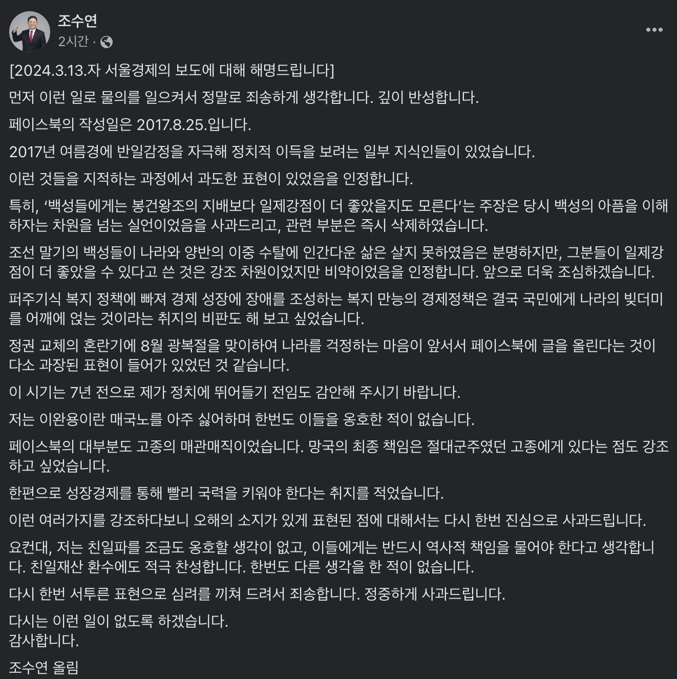 그러면서 분명 본인의 발언들은 실언이었으며, "과거 일제강점기가 봉건왕조 지배보다 좋았을지도.."라는 발언은 즉시 삭제했다고 합니다. 그저 강조의 차원으로 쓴 문장이지만 지나친 비약임을 인정하는 처사인 것 같습니다.