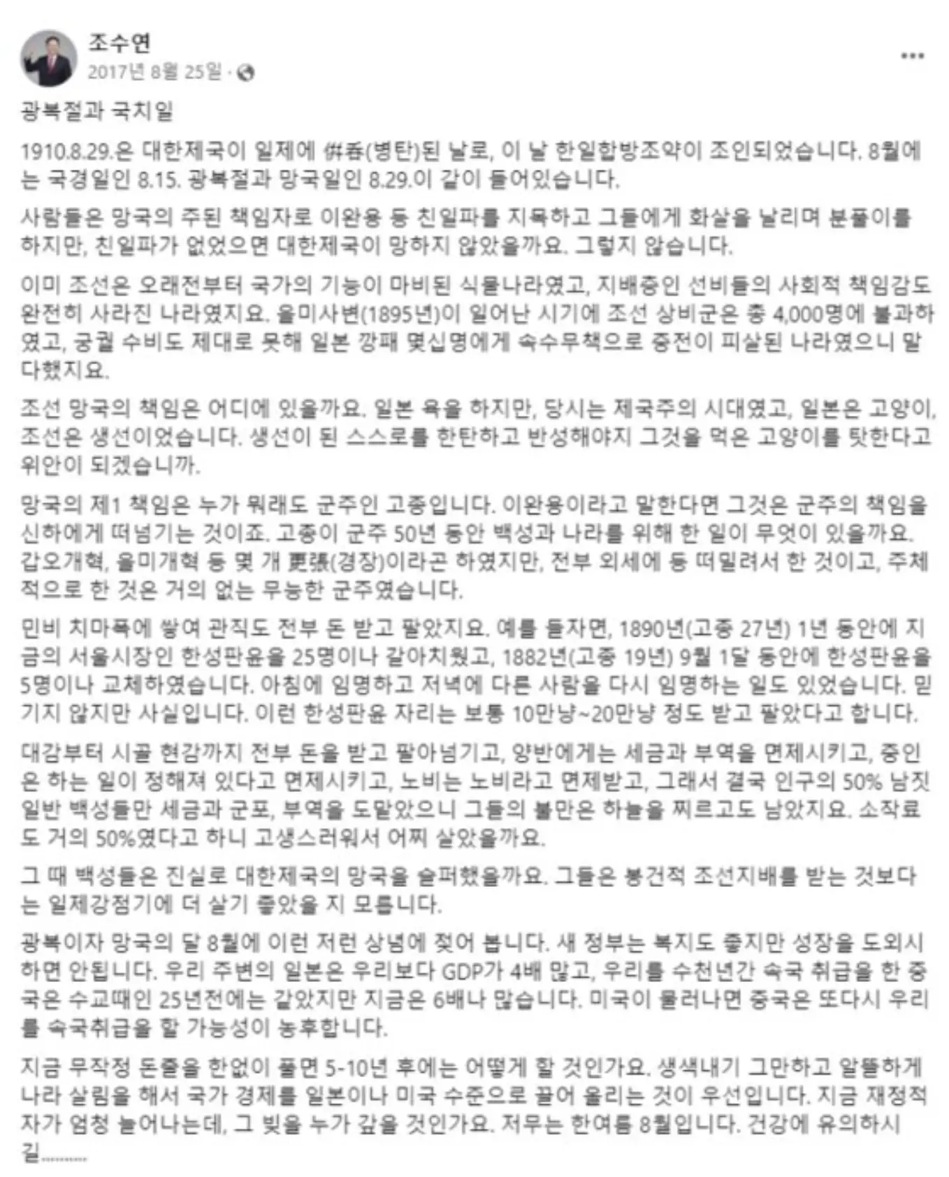 그러면서 분명 본인의 발언들은 실언이었으며, "과거 일제강점기가 봉건왕조 지배보다 좋았을지도.."라는 발언은 즉시 삭제했다고 합니다. 그저 강조의 차원으로 쓴 문장이지만 지나친 비약임을 인정하는 처사인 것 같습니다.